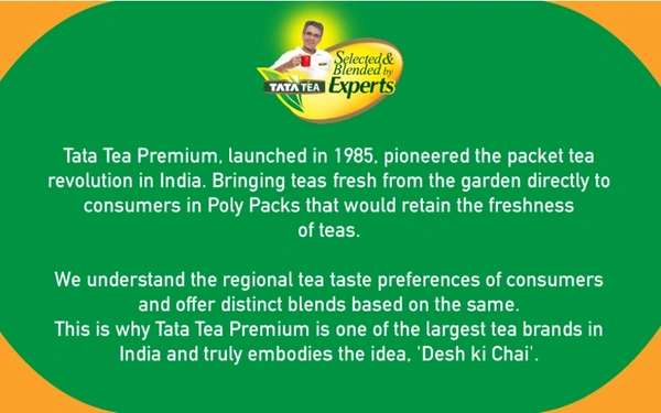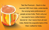 Chai’ is more than a cup of tea; rather it is an integral part of the culture and life of every Indian. While drinking chai is enjoyed across the country, the way people like their cup in India varies across regions. Tata Tea Premium- Desh ki Chai, sourced solely from India, understands these varying taste preferences and hence our tea experts have crafted a unique blend that ‘chai’ lovers across India will enjoy. Blended since 1985.